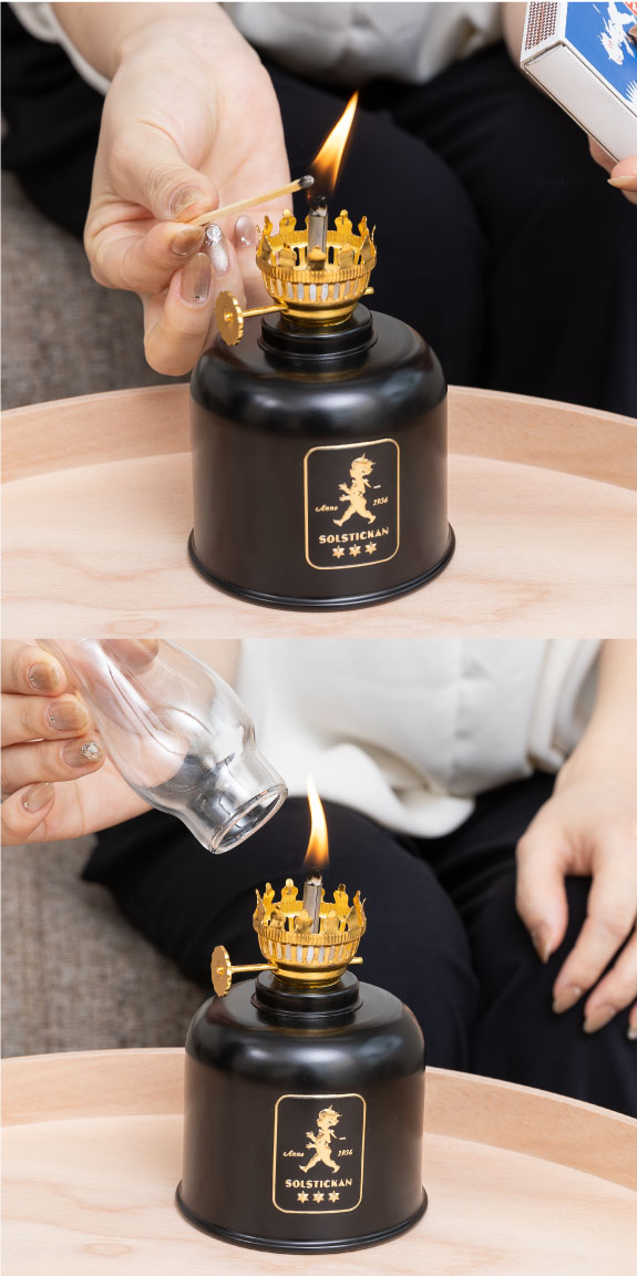 4.芯に火をつけ、ホヤ(ガラス製の筒)を設置します。